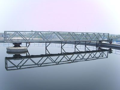 驱动装置推动工作桥沿池平面旋转,工作桥带动刮臂旋转,固定于刮臂上的刮板将泥由池边逐渐刮至池中心的集泥斗中。